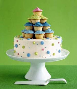Just before serving, arrange 6 to 8 mini cupcakes on top of cake in 1 layer, then stack remaining mini cupcakes on top.