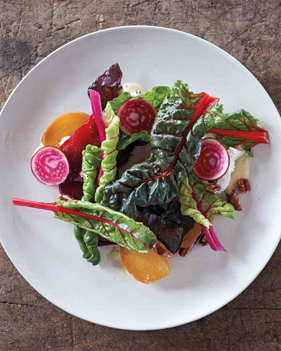 Salad: Combine roasted beets, chard, and pecans in a bowl. Lightly toss with 1/4 cup dressing. Place 1 tablespoon dressing on bottom of each plate, then add salad mixture and goat cheese, dividing evenly. Top with baby beets and serve, with remaining dressing on the side.