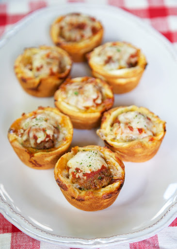 Divide the cream cheese mixture in the bottom of each muffin cup. Place meatballs on top of cheese; top each meatball with 2 tablespoons spaghetti sauce. Sprinkle with remaining mozzarella cheese.