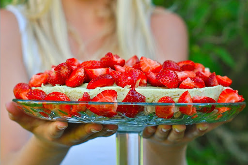 This is dense and rich and absolutely delicious. The lime, nuts and avocado blend so well with the sweetness of the agave, the dates and the coconut. Top it off with fresh strawberries – real food love and a perfect dessert, afternoon treat or even birthday cake.