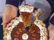forc caremelized pecans below) Cut pie into eight servings and garnish each slice with a dollop of whipped cream and 2 caramelized pecan halves.