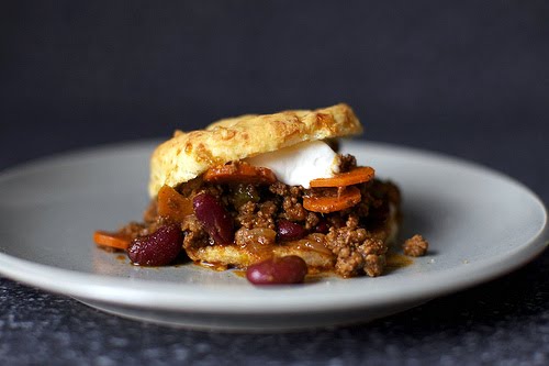 Serve ladled over a split Sour Cream and Cheddar Biscuit, below, with additional sour cream and pickled jalapenos, if desired.