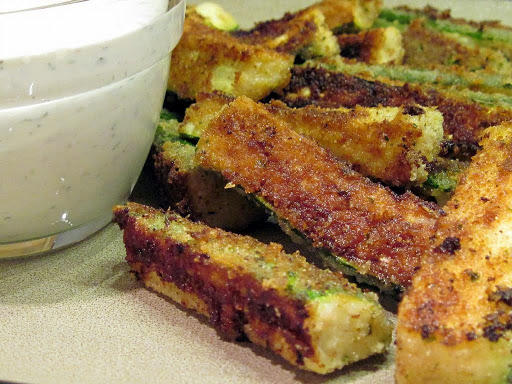 4. Heat 1 tablespoon of olive oil in a large nonstick skillet over medium heat. Dip the zucchini in the egg whites, coat it with bread crumbs, and place in the hot skillet. Repeat with enough of the zucchini so that you don't overcrowd the pan. Brown on all 3 sides, using thongs to turn the zucchini. You will need to cook them in 4 or 5 batches. Add more oil in between each batch. (Keep the cooked zucchini warm on a sheet pan in a 200 degree F oven while you're cooking all of the zucchini.)