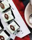 Using a paring knife, cut corners off mint candies to shape each into a football. Press 3 sprinkles onto each, using frosting as glue. Frost cooled cake. Arrange footballs on cake in 4 rows of 3. Cake will keep, covered, for up to 4 days. Slice just before serving.