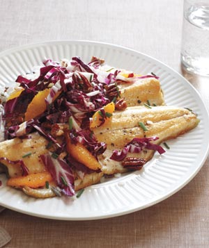 Cut away the peel and pith of 2 of the oranges. Working over a medium bowl, cut along both sides of each orange segment, releasing the segments into the bowl. Juice the remaining orange and add the juice to the bowl along with the radicchio, pecans, 1 tablespoon of the oil, ½ teaspoon salt, and ¼ teaspoon pepper.