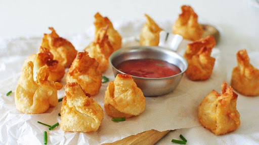 Arrange the wonton wrappers on a flat surface. Dollop about a teaspoon of the cream cheese mixture in the center of each wrapper. Dip your finger in a little water and run along the edges of the wrappers. Pull the edges together and twist to seal. Continue until all the wontons are filled and sealed.