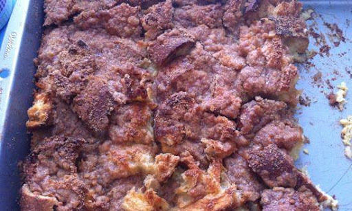 Preheat the oven to 350 degrees F. Spray a 9 x 13 inch baking pan with non-stick cooking spray. Tear the bread into chunks and place them in the greased pan. Mix together eggs, milk, half and half or cream, sugar, and vanilla and pour the mixture evenly over the bread. In another bowl, mix together the flour, brown sugar, cinnamon, and salt. Add the butter and mix until the batter comes somewhat together. Sprinkle the flour/sugar mixture evenly over the top of the bread mixture. Bake for 45 - 60 minutes, until golden brown. Store leftovers in fridge, tightly covered.