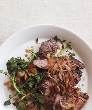 Wipe out the skillet and heat 1 teaspoon of the remaining oil over medium heat. Season the steak with ½ teaspoon each salt and pepper and cook, 3 to 5 minutes per side for medium-rare. Let rest for 5 minutes before serving.