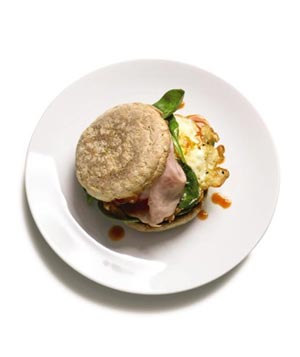 Form 2 sandwiches with the English muffins, fried eggs, spinach, and ham. Season with ¼ teaspoon each salt and pepper. Serve with hot sauce, if desired.