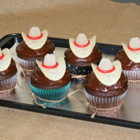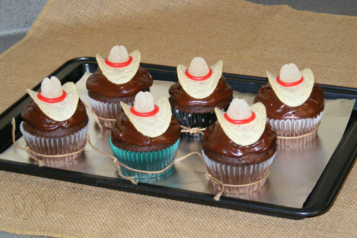 Yeehaw!! Frosted chocolate cupcakes are given a "hat" and tied off with a "lasso". Of course, a couple of gals had to get in the middle of the pic!