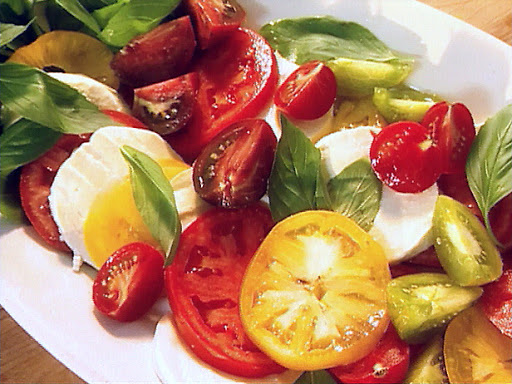 Slice the tomatoes and mozzarella and arrange casually with the basil leaves on a large platter. Drizzle with olive oil. Sprinkle with salt and pepper and serve at room temperature.