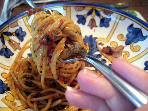 Cook the spaghetti in the boiling water according to package directions, until just short of al dente. Drain the spaghetti, add it to the pan with the sauce and toss over high heat for 1 minute. Serve immediately.