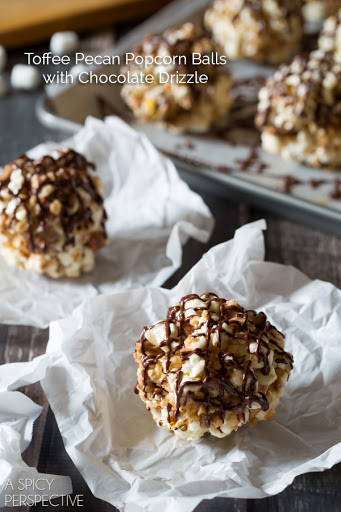 Toffee Pecan Popcorn Balls with Chocolate Drizzle