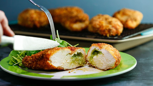 Arrange 3 dishes: one with flour, another with the beaten eggs and the third with panko and breadcrumbs with cheese & a little nutmeg. Season each dish with salt and pepper. Bread the chicken, coating them in flour, then egg and ending with breadcrumbs.