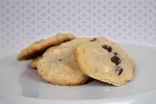 Take the bowl out of the mixer and add the white and semi-sweet chips by hand. Stir them in so that they are evenly distributed.