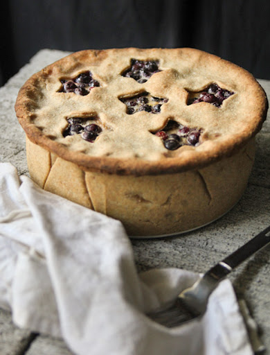 Roll out the small ball of dough, keeping it in a circular shape. Once it is about 1 cm thick, take a star cookie cutter and cut six stars out of the pie, one in the exact center and five around the center star. Pour the filling into the pie and then place the starred crust on top. Use your thumbs to press the edges of the crust together and cut off any excess crust. After the edges of the crusts are secured, lift them up a bit so that they don't hang down over the edge of the pan too much, otherwise when the pie is done and you unhinge the cake pan, the crusts will break off when the sides of the pan expand.