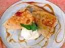 In the bowl of an electric mixer, beat the cheese until smooth. Add the sugar and bananas, continue to beat until smooth. Spread 1/4 cup of the filling over half of each tortilla. Fold the other half over the filling and press slightly. Place on a large plate and cover with plastic wrap. Refrigerate until the filling sets, about 30 minutes. In a large saute pan, over medium heat, melt 1 tablespoon of the butter. Pan-fry the tortillas in batches, 3 at a time, until golden on each side, about 2 minutes per side. Repeat the above process with the remaining butter and filled tortillas. To serve, slice each filled tortilla into thirds. Arrange the slices in the center of each serving plate. Spoon a 1/4 cup of the warm caramel sauce over each plate. Peel the bananas and slice 1/4-inch thick. Garnish each plate with the sliced bananas, a dollop of whipped cream and a sprig of fresh mint.
