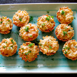In a large bowl, combine cream cheese, crab, mayonnaise, Parmesan cheese, Cheddar cheese, green onions and Worcestershire sauce. Spoon 1 teaspoon of mixture into tarts and garnish with paprika.