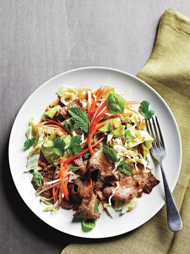 3. In a large bowl, combine cabbage and remaining ingredients. Add 6 tablespoons dressing to cabbage mixture; toss well. Toss steak in remaining 2 tablespoons dressing. Add steak to cabbage mixture; toss to combine.
