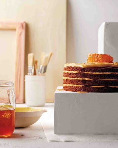 Assembly: Using a long serrated knife, cut each cake in half horizontally. Place a cake bottom on a serving plate or cake stand. Spread 2 tablespoons honey over top. Spread 1/2 cup curd over top, stopping slightly short of edges, then place a cake top on curd, cut-side up. Spread with 2 tablespoons honey and another 1/2 cup curd.