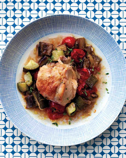 Preheat oven to 450 degrees with rack in upper third. In a large straight-sided ovenproof skillet, heat 1/4 cup oil over medium-high. Add eggplant and cook, stirring frequently, until just beginning to brown, about 4 minutes. Add zucchini, garlic, and remaining 1 tablespoon oil. Cook, stirring, until garlic is fragrant, about 1 minute. Stir in tomatoes and thyme; season with salt and pepper.