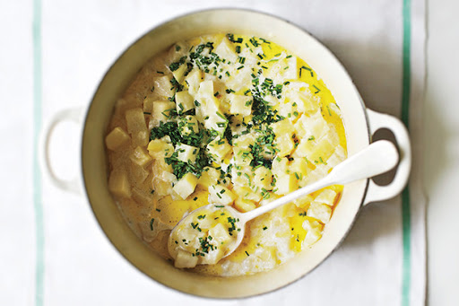Season with salt; stir in most of the chives. Top with remaining chives before serving.