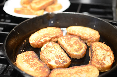 Preheat cast iron skillet over medium heat. Spray with nonstick spray and add a tablespoon of butter. Cook bread on each side until brown; repeating batches until all the batter is used up. Serve French toast with butter and cinnamon sugar.