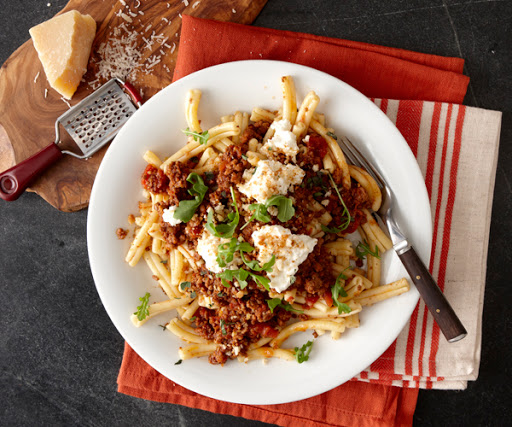 To serve, transfer the cooked pasta to a large serving bowl. Add 1 cup of the ragù to the pasta and toss. Top with the remaining ragù and dollop with heaping tablespoons of the ricotta. Garnish with the arugula, breadcrumbs, and oregano. Serve with the Parmigiano on the side.