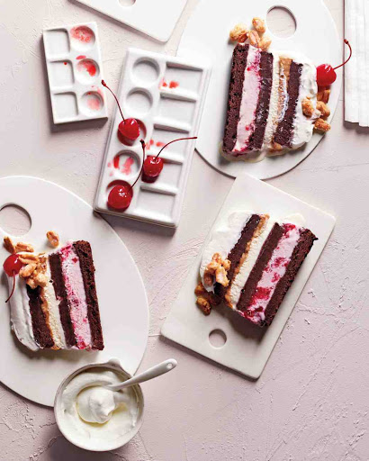 Assembly: Line an 8 1/2-by-4 1/2-inch loaf pan with plastic wrap. Use parchment to lift brownie from baking pan. Cut crosswise into 3 pieces, one piece cut to fit bottom of loaf pan exactly, the next slightly wider, and the last widest of all (to match size of pan, which gets wider toward top).