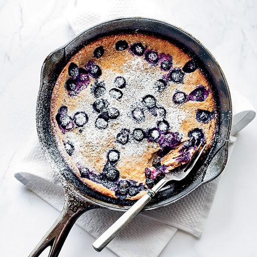 Preheat the oven to 425°. In a bowl, whisk the flour with the milk, pomegranate juice and eggs until blended. In a 12-inch skillet, melt the butter over high heat until foamy. Pour in the batter and sprinkle on the blueberries. Transfer the skillet to the oven and bake for 20 minutes, until the pancake is golden brown. Dust the pancake with confectioners’ sugar and serve immediately.