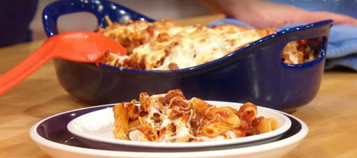 Cook pasta about 6 minutes, shy of al dente. Toss pasta with sauce and place in casserole. Top with cubes of mozzarella and sprinkle with parm. Bake from room temperature at 400ºF until cheeses melted and bubbly, 20 minutes. If cooking from refrigerated or frozen, after pasta comes to room temp, cover with foil and bake 30 minutes then uncover to lightly brown, another 10-15 minutes.