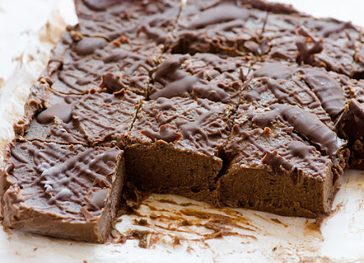 In a powerful blender or food processor, process all ingredients (except cacao nibs and drizzle) until very smooth. Add cacao nibs or mini chocolate chips and pulse a few times. Pour into lined with parchment paper 8" x 8" square dish. Level with spatula, drizzle with chocolate (optional) and freeze for at least 3 hours. Cut into 16 squares and enjoy.