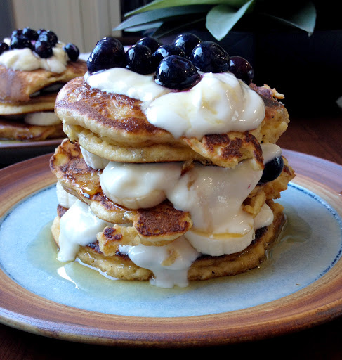 Place one pancake each on a plate then add sliced banana, a few scattered blueberries, a dollop of Coyo and a drizzle of maple syrup.
