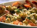Starting from the outer edge of a 14-inch oval gratin dish, arrange the shrimp in a single layer cut side down with the tails curling up and towards the center of the dish. Pour the remaining marinade over the shrimp. Spread the butter mixture evenly over the shrimp. Bake for 10 to 12 minutes until hot and bubbly. If you like the top browned, place under a broiler for 1 minute. Serve with lemon wedges.