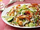 Return the shrimp to the pan and heat through, about 2 minutes. Transfer the mixture to a platter; top with bean sprouts, jalapenos and the remaining 1/4 cup peanuts. Serve with lime wedges.
