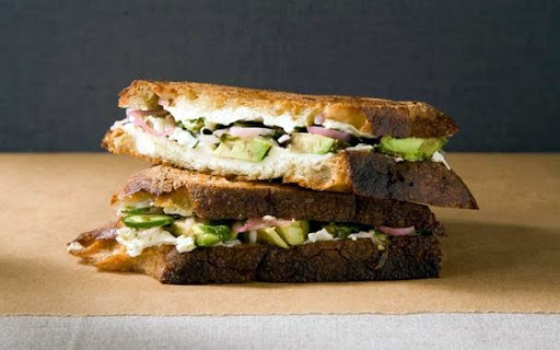 • Pungent cotija cheese becomes the main event in this delectable sandwich. As the cheese melts, it melds with the buttery avocado; a layer of cilantro-flecked shallot keeps the richness in check.