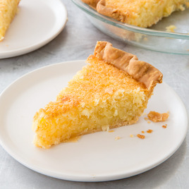 This custard pie combines a rich, dense filling with softened shreds of coconut. For a proper custard consistency without eggy flavor, we use two whole eggs and an extra yolk; since it’s the sulfur-rich egg whites that contribute the eggy flavor, we omit the final white. Buttermilk contributes richness and an acidic tang. We found that using unsweetened shredded coconut keeps the pie from becoming unduly sweet. Since the dried coconut doesn’t fully soften as the pie bakes, we soak it in the buttermilk for 15 minutes before adding it to the custard.