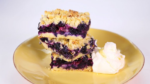 4. Toss together the blueberries, lemon juice, remaining sugar and cornstarch. Pour mixture over the crust. Crumble the remaining flour mixture over the blueberries.