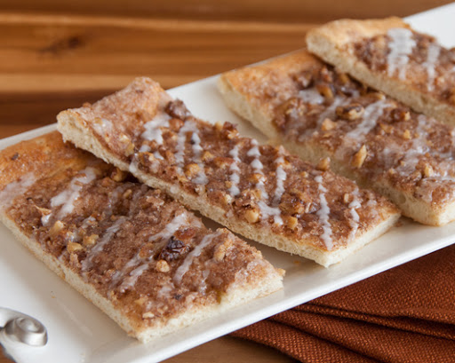 Combine sugar, nuts and cinnamon and sprinkle over the buttered dough. Bake at 375°F 12-15 minutes or until golden brown on the edges. Combine glaze ingredients and drizzle over warm flat bread.