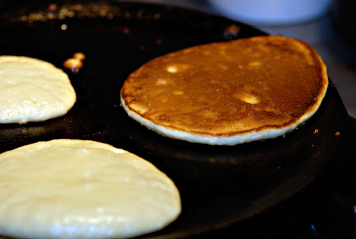 Pancakes will form little bubbles, when bubbles open, flip pancakes over and cook other side