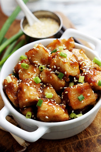 4. Toss chicken in the prepared sauce. Transfer to baking dish. Bake for 20-25 minutes until chicken is cooked through. Serve with sesame seeds and green onions for garnish if desired. Enjoy!