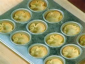 Roll slices of bread to flatten. Brush with melted butter. Press one slice of bread into each cavity of a muffin pan. Bake at 400 degrees for 5 minutes or until just golden.