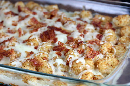 Place into the oven and bake at 425 degrees F. for 15-20 minutes until the tater tots are crispy and golden. Remove from the oven. Top with the remaining cheese and crumbled bacon. Return to the oven and bake for about 5 minutes, until the cheese has melted.