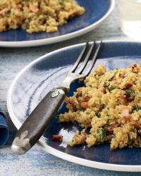 In a medium saucepan, heat the oil. Add the bacon and cook over moderately high heat until the fat has rendered, about 2 minutes. Add the shallot and cook, stirring a few times, until softened but not browned, about 1 minute. Add the quinoa, stock and sage and bring to a boil. Cover and cook over low heat until the stock has been absorbed, about 17 minutes. Remove the quinoa from the heat and let stand, covered, for 5 minutes. Discard the sage and fluff the quinoa with a fork. Stir in the chives, parsley and toasted almonds. Season the quinoa with salt and pepper and serve.