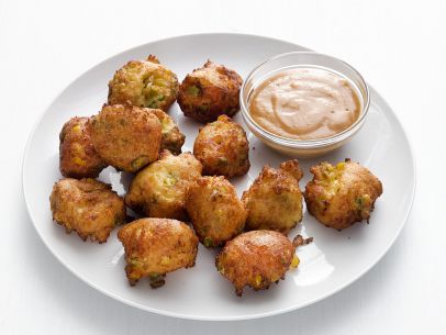 Combine 1/2 cup each flour and cornmeal, 1 tablespoon sugar, 1 teaspoon baking powder and 3/4 teaspoon salt. Stir in 1/2 cup each buttermilk, sliced pickled okra, shredded smoked cheddar and corn kernels, 3 sliced scallions and 1 lightly beaten egg. Deep-fry heaping tablespoons in 350 degrees F vegetable oil, turning, until golden, 5 minutes. Drain on a paper towel-lined plate; season with salt. Serve with honey mustard.