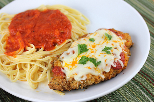 Step 2: Heat about ½ inch of vegetable oil in a large deep skillet to medium high heat. Add chicken and cook until the chicken is browned on one side, flip and cook until browned on the other side (do not cook all the way through). Remove the chicken from the pan and place into a greased oven safe baking dish. Top each chicken breast with marinara sauce.