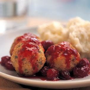 Divide the meatballs among dinner plates, spoon the cranberry sauce over them and serve immediately. Serves 4.