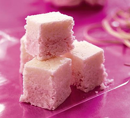 2. Split the mix into two and knead a very small amount of food colouring into one half. Dust a board with icing sugar, then shape each half into a smooth rectangle and place one on top of the other. Roll with a rolling pin, re-shaping with your hands every couple of rolls, until you have a rectangle of two-tone coconut ice about 3cm thick.