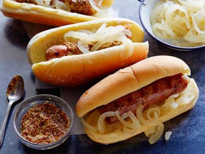 Place brats in a Dutch oven with onions and butter, cover the brats with beer. Bring to a boil and reduce to simmer until brats are cooked. Remove brats and set aside beer mixture. Grill brats until golden brown and return to beer mixture until ready to serve. Serve brats on fresh baked brat buns with sauerkraut, onions, green peppers, ketchup, and/or mustard.