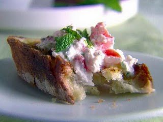 To serve, either spoon the cheese topping over the bread and sprinkle more chopped mint over the bruschetta for garnish, or place the cheese topping in a bowl and serve with the grilled bread alongside.